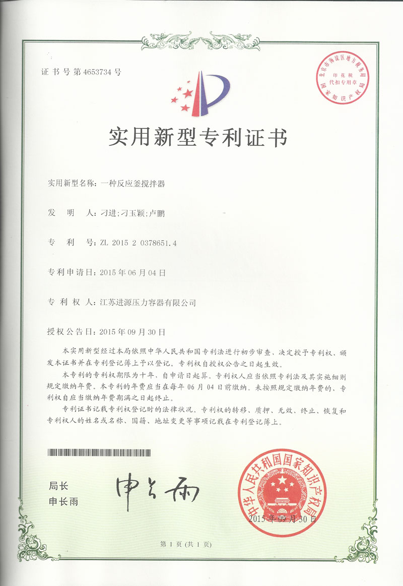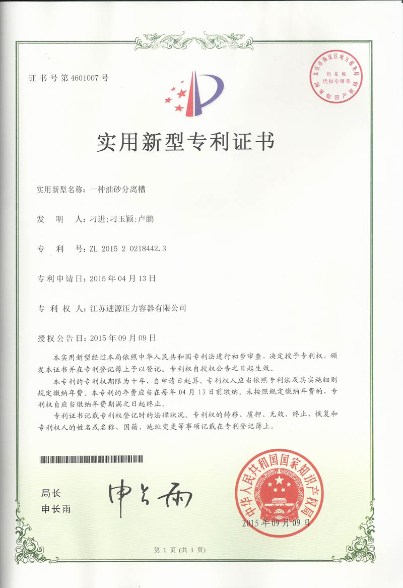 江蘇進(jìn)源壓力容器有限公司自主研發(fā)的“一種油砂分離槽”、“一種反應(yīng)釜攪拌器”、“螺旋板換熱器”、“一種高效節(jié)能蒸發(fā)式冷凝器”等四項(xiàng)創(chuàng)新成果,均獲得國(guó)家知識(shí)產(chǎn)權(quán)局專利授權(quán),專利期限為十年。另外申報(bào)的15項(xiàng)發(fā)明專利也被國(guó)家知識(shí)產(chǎn)權(quán)局受理。
